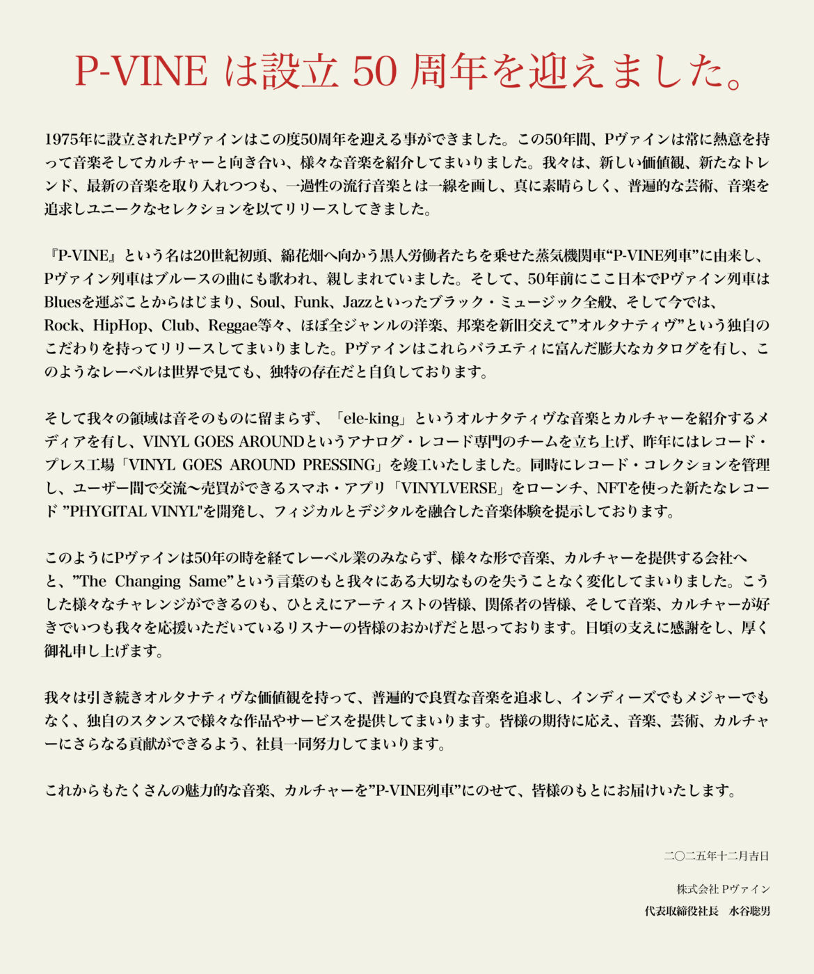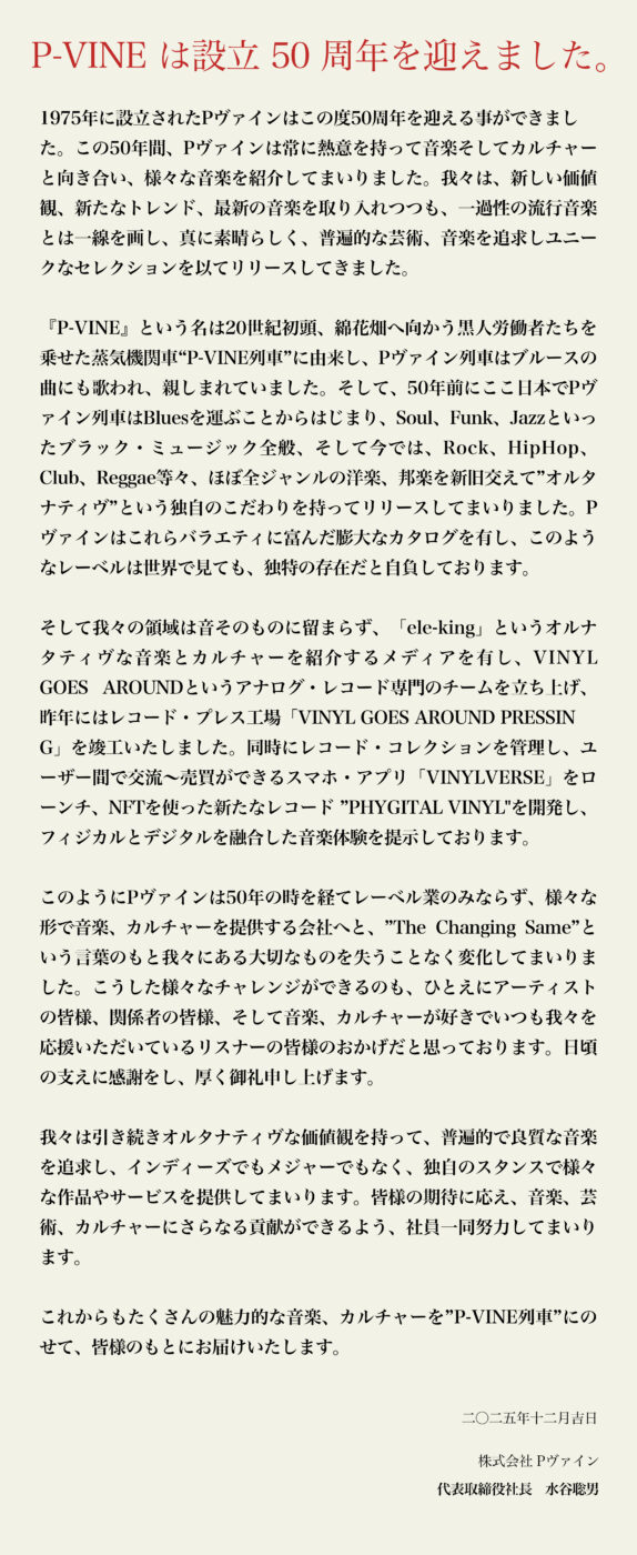- 2025.12.09P-VINE 50周年特設サイトを開設いたしました